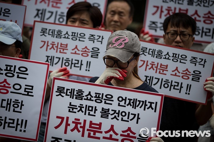 (서울=포커스뉴스) 25일 오전 서울 중구 롯데백화점 앞에서 열린 롯데홈쇼핑 협력사 비상대책위원회 생존권 보장 촉구 집회에 참석한 한 회원이 눈물 흘리고 있다.