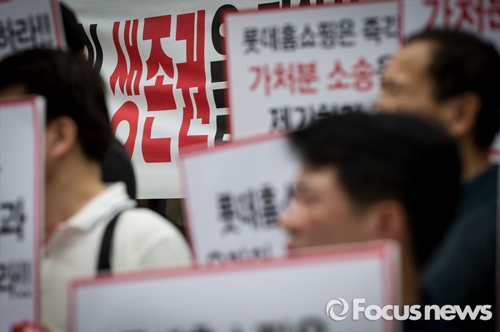 (서울=포커스뉴스) 25일 오전 서울 중구 롯데백화점 앞에서 롯데홈쇼핑 협력사 비상대책위원회원들이 생존권 보장을 촉구하며 집회를 열고 있다.