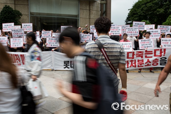 (서울=포커스뉴스) 25일 오전 서울 중구 롯데백화점 앞에서 롯데홈쇼핑 협력사 비상대책위원회원들이 생존권 보장을 촉구하며 집회를 열고 있다.