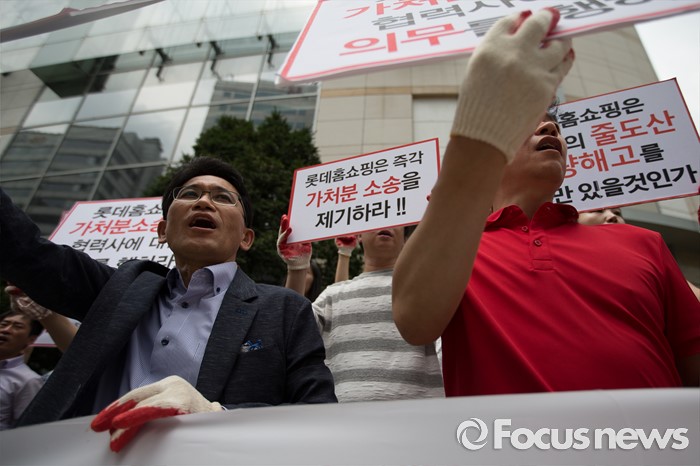 (서울=포커스뉴스) 25일 오전 서울 중구 롯데백화점 앞에서 롯데홈쇼핑 협력사 비상대책위원회원들이 생존권 보장을 촉구하며 구호를 외치고 있다.