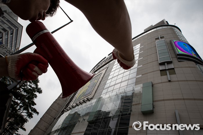 (서울=포커스뉴스) 25일 오전 서울 중구 롯데백화점 앞에서 롯데홈쇼핑 협력사 비상대책위원회원들이 생존권 보장을 촉구하며 구호를 외치고 있다.