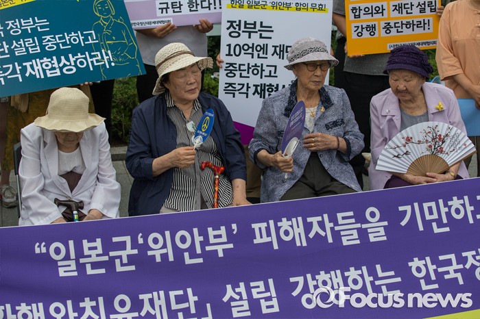 (서울=포커스뉴스) 25일 오전 서울 종로구 정부서울청사 앞에서 화해·치유재단 설립 강행하는 정부를 규탄하는 정대협(한국정신대문제대책협의회) 및 일본군 위안부 피해자 할머니들의 집회가 열리고 있다. (왼쪽부터) 이옥선, 이용수, 김복동, 길원옥 할머니