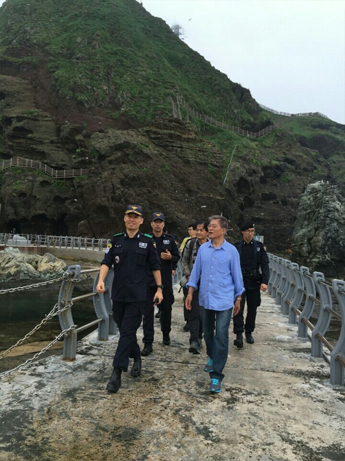 (서울=포커스뉴스) 문재인 더불어민주당 전 대표가 광복절을 앞두고 25일 독도를 방문, 송지원 경비대장에게 설명을 들으며 둘러보고 있다. <사진제공=문재인 전 대표측>