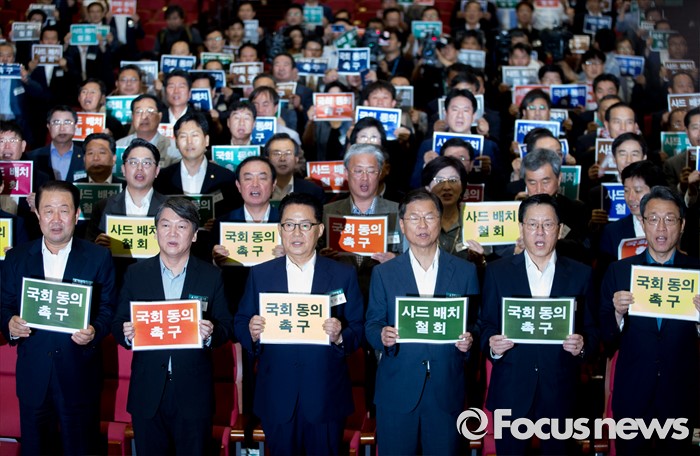 (서울=포커스뉴스) 25일 오후 서울 여의도 국회 의원회관에서 열린 국민의당 지역위원장 임명장 수여식 및 연석회의에 참석한 박주선(앞줄 왼쪽부터) 국회 부의장, 안철수 전 상임공동대표, 박지원 비상대책위원장, 천정배 전 공동대표, 주승용 비대위원, 김성식 정책위의장 등이 사드배치 철회 등을 촉구하는 피켓 퍼포먼스를 하고 있다.