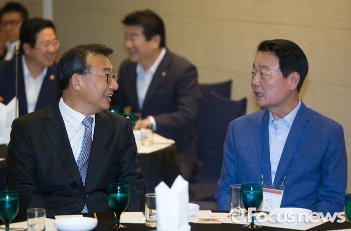 (서울=포커스뉴스) 전당대회 대표최고위원 출마를 선언한 이정현(왼쪽), 한선교 새누리당 의원이 25일 오후 서울 여의도 중소기업중앙회관에서 열린 중앙위원회 전국시도당연합회 월례회 행사에 참석해 대화하고 있다.