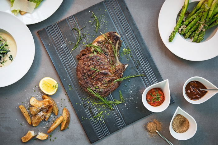 목요일 디너에서만 만나볼 수 있는 스페셜 스테이크 메뉴에는 W만의 요리법으로 뼈째 숙성시켜 풍미가 풍부한 1.3 kg의 커다란 쇠고기 프라임 본-인 꽃등심 스테이크가 소개된다.