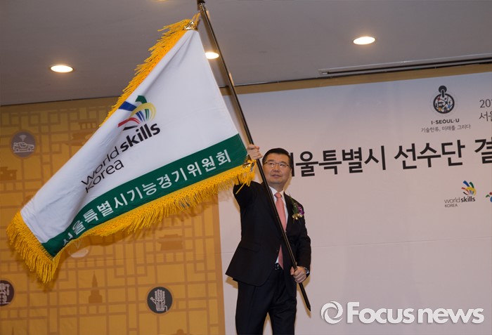 (서울=포커스뉴스) 26일 오전 서울 종로구 세종문화회관에서 열린 '2016 전국기능경기대회 서울특별시 선수단 결단식 및 홍보대사 위촉식'에 참석한 류경기 서울시 행정1부시장이 손수단기를 흔들고 있다.