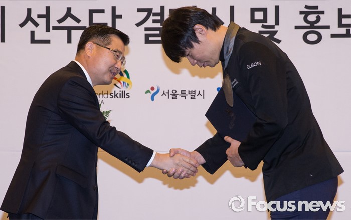 (서울=포커스뉴스) 26일 오전 서울 종로구 세종문화회관에서 열린 '2016 전국기능경기대회 서울특별시 선수단 결단식 및 홍보대사 위촉식'에 참석한 류경기(왼쪽) 서울시 행정1부시장이 요리사 최현석과 악수를 하고 있다.