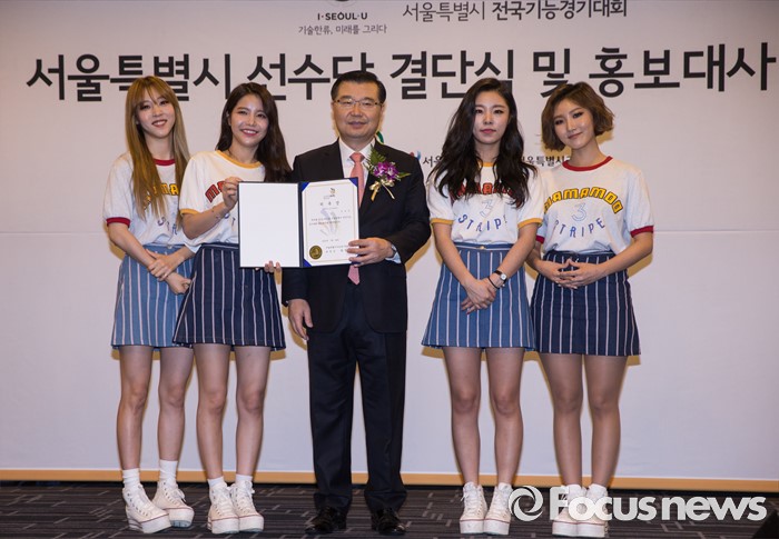 (서울=포커스뉴스) 26일 오전 서울 종로구 세종문화회관에서 열린 '2016 전국기능경기대회 서울특별시 선수단 결단식 및 홍보대사 위촉식'에 참석한 류경기(가운데) 서울시 행정1부시장이 걸그룹 마마무와 기념촬영을 하고 있다.