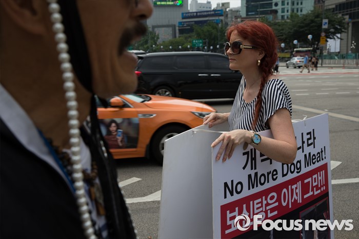 (서울=포커스뉴스) 26일 오전 서울 종로구 광화문광장에서 세이브 코리언 독스 회원(오른쪽)이 개고기 문화를 반대하는 피켓을 들고 있다.