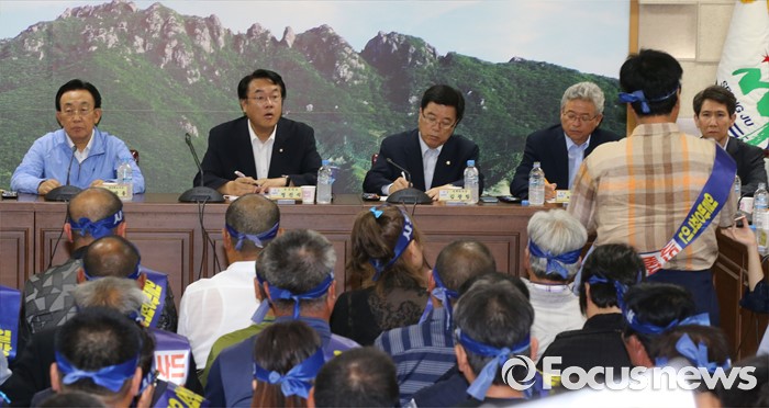 (성주=포커스뉴스) 26일 오전 경북 성주군청을 찾은 정신석 새누리당 원내대표와 지도부들이 성주군민들과 간담회를 갖고 있다.
