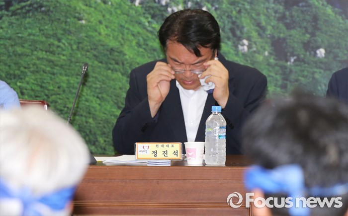 (성주=포커스뉴스) 26일 오전 경북 성주군청을 찾은 정신석 새누리당 원내대표와 지도부들이 성주군민들과 간담회를 갖고 의견을 수렴하던 중 정 원내대표가 안경을 고쳐쓰고 있다.