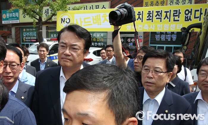 (성주=포커스뉴스) 26일 오전 경북 성주군청을 찾은 정신석 새누리당 원내대표와 지도부들이 성주군민들에게 항의 받고 있다.