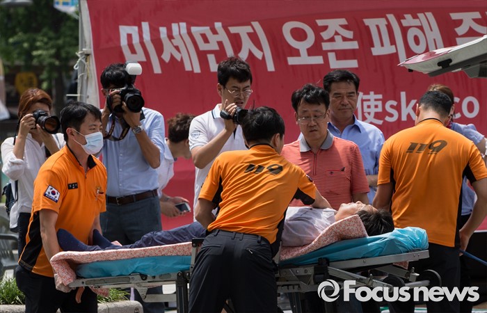 (서울=포커스뉴스) 석탄화력발전소 증설 중단을 요구하며 단식농성을 일주일 째 이어오던 김홍장 당진시장이 26일 오후 서울 종로구 광화문광장에서 건강 이상으로 들것에 실려 구급차로 향하고 있다.