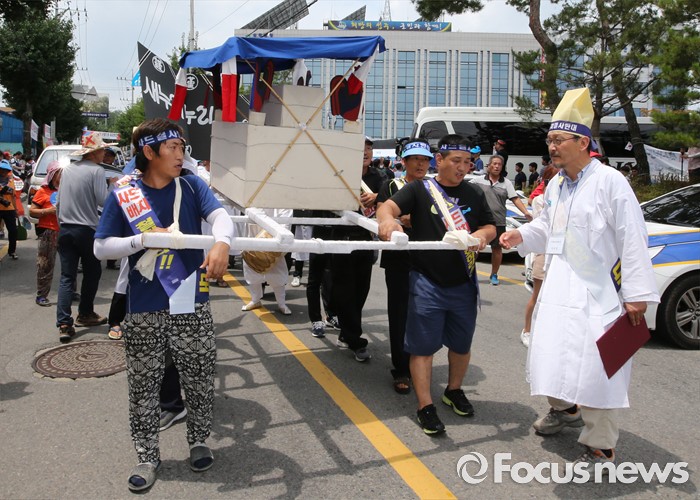 (성주=포커스뉴스) 26일 오전 경북 성주군청을 찾은 정신석 새누리당 원내대표와 지도부들이 성주군민들과 간담회를 가진 가운데 성주주민들이 상여를 매고 새누리당 버스 앞에서 사드배치 반대를 촉구하고 있다.