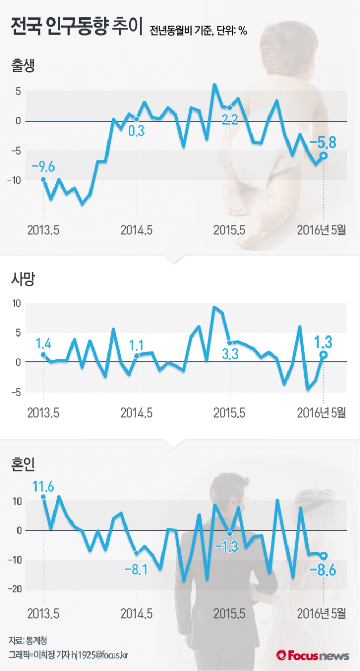 (서울=포커스뉴스) 26일 통계청이 공개한 ‘5월 인구동향’에 따르면 5월 출생아 수는 3만4400명으로 전년보다 5.8% 감소했다. 전국 출생아수는 전년동월대비로 지난 2015년 12월부터 6개월 연속 감소세다. 5월 혼인 건수도 전년동월대비 8.6% 줄었다.
