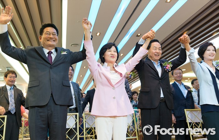 (서울=포커스뉴스) 26일 오후 서울 서초구 엘루체에서 열린 더불어민주당 서울특별시당 서초갑 정기지역대의원대회에서 전당대회 출마를 선언한 송영길(왼쪽부터) 의원과 추미애 의원, 김상곤 의원이 만세삼창을 하고 있다.