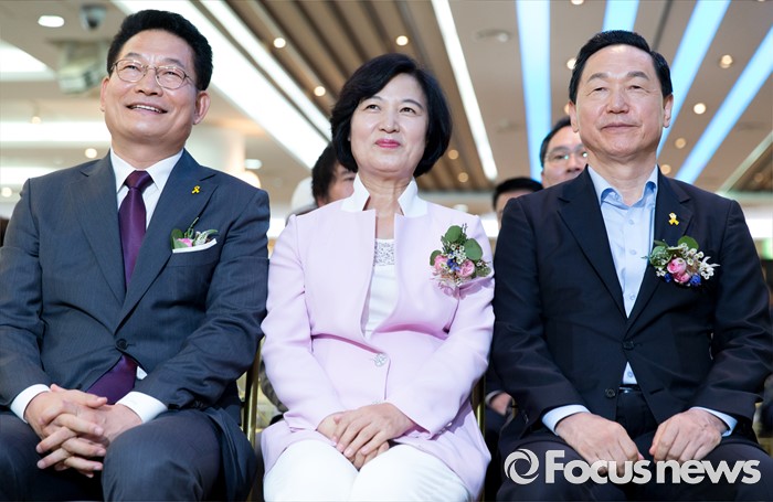 (서울=포커스뉴스) 26일 오후 서울 서초구 엘루체에서 열린 더불어민주당 서울특별시당 서초갑 정기지역대의원대회에서 전당대회 출마를 선언한 송영길(왼쪽부터) 의원과 추미애 의원, 김상곤 의원이 자리에 참석해있다.