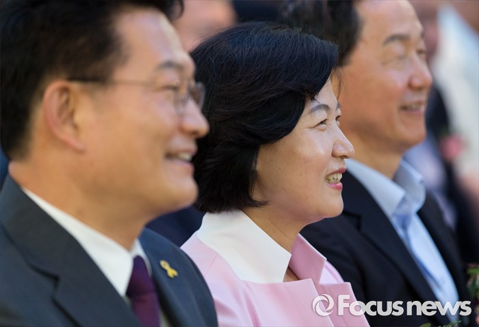 (서울=포커스뉴스) 26일 오후 서울 서초구 엘루체에서 열린 더불어민주당 서울특별시당 서초갑 정기지역대의원대회에서 전당대회 출마를 선언한 송영길(왼쪽부터) 의원과 추미애 의원, 김상곤 의원이 자리에 참석해있다.