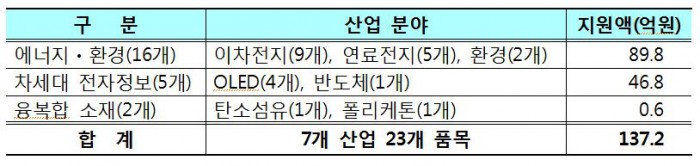 지원 품목은 에너지·환경 분야에서 이차전지와 온실가스저감장치 등의 생산 설비·원부자재 16개 품목(관세지원액 89억8000만원), 차세대 전자정보 장치 분야에서 OLED·시스템반도체 생산 설비 5개 품목(관세지원액 46억8000만원), 융복합 소재 분야에서 탄소섬유·폴리케톤 생산 설비 2개 품목관세지원액 6000만원)이다.