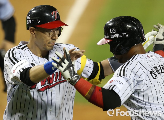 (서울=포커스뉴스) 26일 서울 잠실구장에서 열린 2016 프로야구 롯데-LG 경기 5회말 1사 2루에서 LG 정성훈이 우중간 홈런을 치고 선행주자 히메네스의 환영을 받으며 홈인하고 있다.