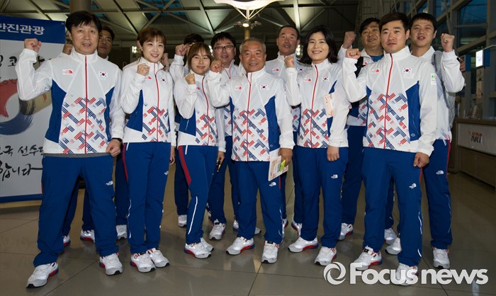 (인천공항=포커스뉴스) 남미에서 최초로 열리는 제31회 브라질 리우데자네이루 하계올림픽에 참가하는 대한민국 사격 국가대표팀 선수들이 26일 오후 인천국제공항에서 출국 전 파이팅을 외치고 있다.