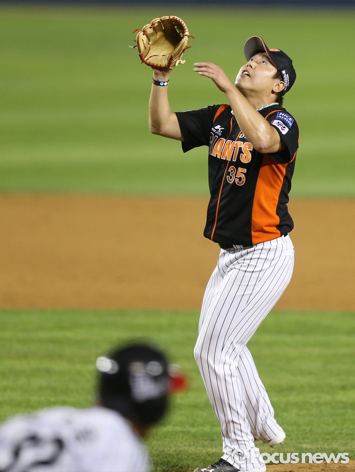 (서울=포커스뉴스) 26일 서울 잠실구장에서 열린 2016 프로야구 롯데-LG 경기 8회말 1사 1루에서 롯데 투수 이명우가 LG 이천웅의 바운드가 큰 땅볼 타구를 잡으려 바라보고 있다.
