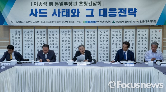 (서울=포커스뉴스) 27일 오전 서울 여의도 국회 귀빈식당에서 야3당 소속 의원들 주최로 열린 사드사태와 그 대응전략 간담회에 참석한 이종석 전 통일부 장관이 발언하고 있다.