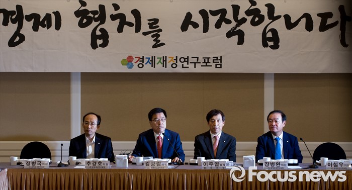 (서울=포커스뉴스) 27일 오전 서울 여의도 국회 귀빈식당에서 열린 경재재정연구포럼 조찬 간담회에 참석한 김광림 새누리당 정책위의장이 인사말을 하고 있다. 왼쪽부터 추경호 새누리당 의원, 김 정책위의장, 이주열 한국은행 총재, 장병완 국민의당 의원.