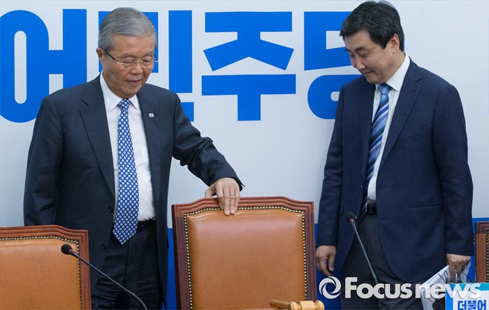 (서울=포커스뉴스) 27일 오전 서울 여의도 국회에서 열린 더불어민주당 비상대책위원회의에 김종인(왼쪽) 비대위 대표와 이종걸 비대위원이 참석하고 있다. 이종걸 비대위원은 당대표 경선 출마를 공식화 했다.