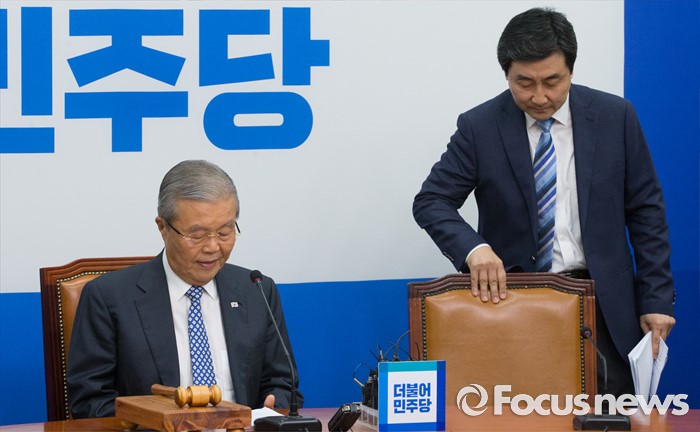 (서울=포커스뉴스) 27일 오전 서울 여의도 국회에서 열린 더불어민주당 비상대책위원회의에 김종인(왼쪽) 비대위 대표와 이종걸 비대위원이 참석하고 있다. 이종걸 비대위원은 당대표 경선 출마를 공식화 했다.