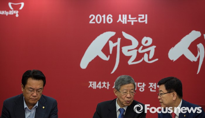 (서울=포커스뉴스) 김희옥(가운데) 새누리당 혁신비상대책위원장과 김광림(오른쪽) 정책위의장이 27일 오전 서울 여의도 새누리당사에서 열린 혁신비상대책위원회의에 참석해 대화 하고 있다.