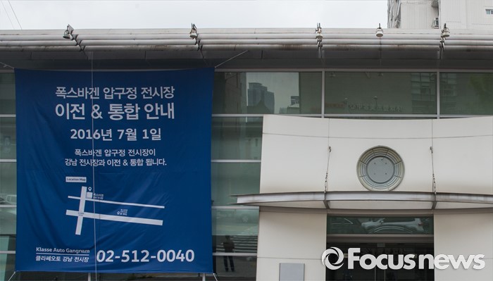 (서울=포커스뉴스) 환경부가 내달 초 폭스바겐 차량에 대한 인증취소와 판매금지 등 행정처분을 확정할 계획을 밝힌 가운데, 11년 간 영업을 이어온 폭스바겐 압구정 전시장이 강남 전시장과 이전ㆍ통합을 알리며 간판을 내렸다. 27일 오전 영업을 종료한 폭스바겐 압구정 전시장에 이전을 알리는 현수막이 걸려 있다.