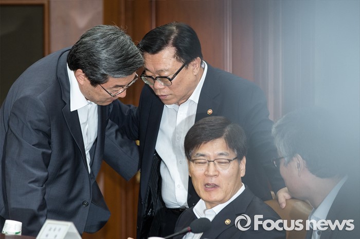 (서울=포커스뉴스) 이동필(왼쪽 두 번째) 농림축산식품부 장관이27일 오전 서울 세종로 정부서울청사에서 경제관계장관회의 참석자들과 이야기 하고 있다.