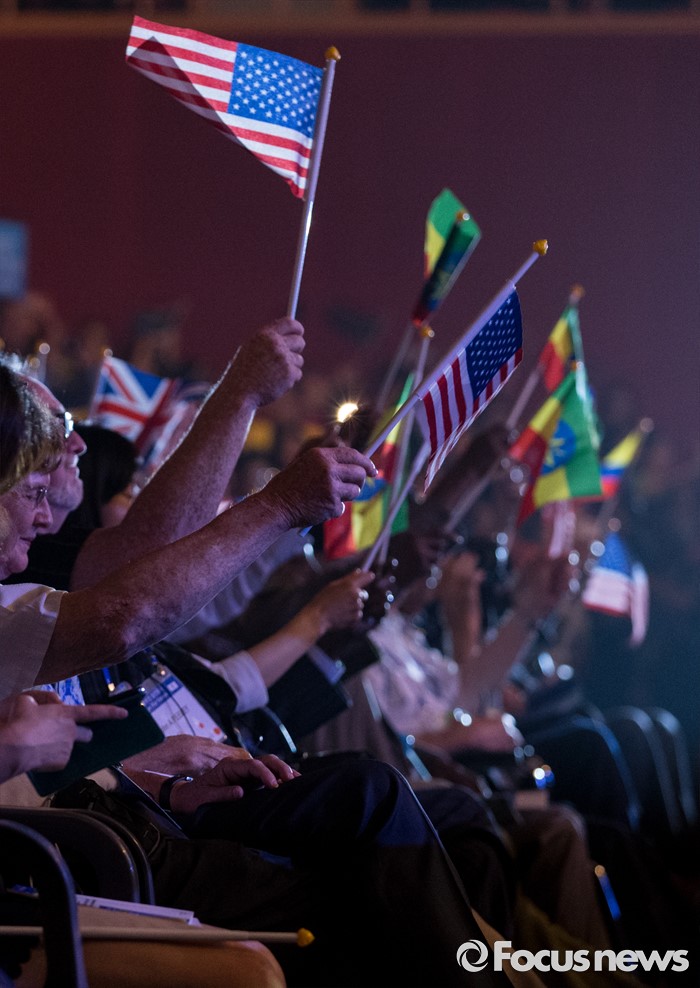 (서울=포커스뉴스) 27일 오전 서울 송파구 올림픽공원 올림픽홀에서 열린 정전협정 63주년 및 유엔군 참전의 날 기념식에서 6·25 전쟁 유엔군 참전용사와 참전국 외교사절단이 국기를 흔들고 있다.