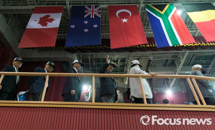 (서울=포커스뉴스) 27일 오전 서울 송파구 올림픽공원 올림픽홀에서 6·25 전쟁 참전용사들이 정전협정 63주년 및 유엔군 참전의 날 기념식을 마치고 퇴장하고 있다.