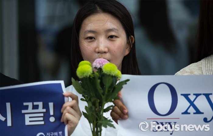 (서울=포커스뉴스) 27일 오전 서울 영등포구에 위치한 옥시레킷벤키저 본사 앞에서 가습기살균제참사전국네트워크 회원들이 '제2의 옥시를 막자-가습기살균제사고 기업 현장조사' 기자회견을 하고 있다.