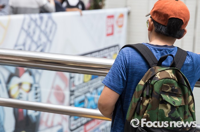 (서울=포커스뉴스) 27일 오전 서울 강남구 코엑스에서 열린 '건프라 엑스포 2016'을 찾은 한 학생이 현수막을 바라보고 있다.