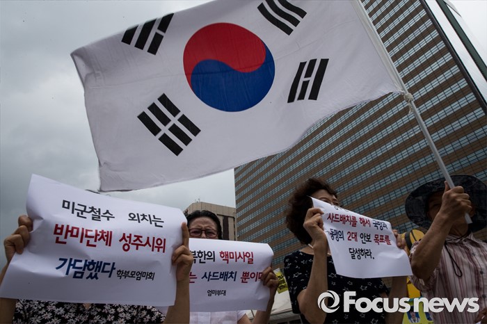 (서울=포커스뉴스) 27일 오전 서울 종로구 광화문광장에서 엄마부대, 나라지키기운동본부 등 4개 단체 회원들이 정전협정 63주년 기자회견을 열고 사드배치를 촉구하고 있다.