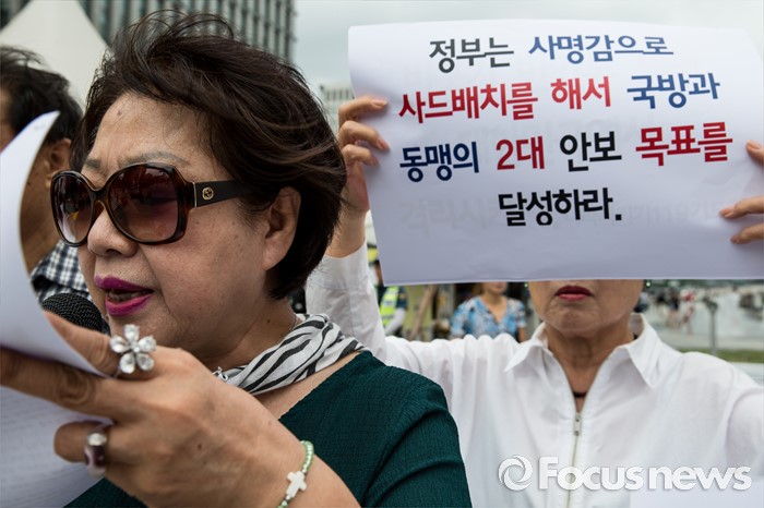 (서울=포커스뉴스) 27일 오전 서울 종로구 광화문광장에서 엄마부대, 나라지키기운동본부 등 4개 단체 회원들이 정전협정 63주년 기자회견을 열고 정부의 사드배치를 촉구하고 있다.