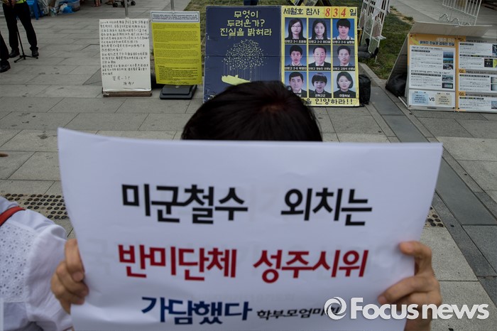 (서울=포커스뉴스) 27일 오전 서울 종로구 광화문광장에서 엄마부대, 나라지키기운동본부 등 4개 단체 회원들이 정전협정 63주년 기자회견을 열고 반미단체 성주시위 가담 의혹을 제기하고 있다.
