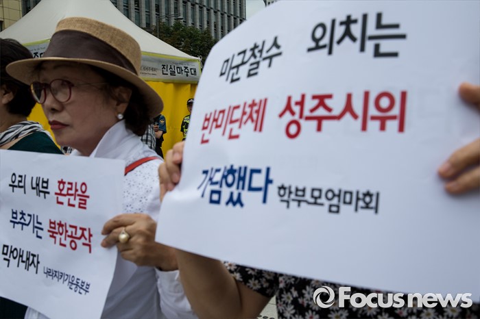 (서울=포커스뉴스) 27일 오전 서울 종로구 광화문광장에서 엄마부대, 나라지키기운동본부 등 4개 단체 회원들이 정전협정 63주년 기자회견을 열고 사드배치를 촉구하고 있다.