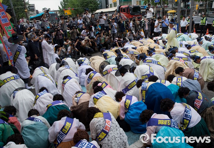 (서울=포커스뉴스) 27일 오전 서울 종로구 청운효자동 주민자치센터 앞에서 열린 '사드 배치 반대 기자회견'에 참석한 성주 유림단체 회원들이 사배하고 있다.