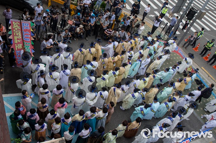 (서울=포커스뉴스) 27일 오전 서울 종로구 청운효자동 주민자치센터 앞에서 열린 '사드 배치 반대 기자회견'에 참석한 성주 유림단체 회원들이 선정 기준에 대한 투명한 정보공개를 요구하고 있다.