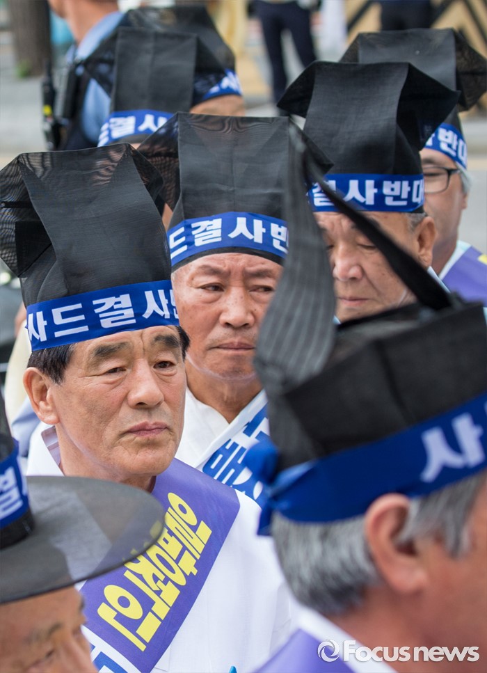(서울=포커스뉴스) 27일 오전 서울 종로구 청운효자동 주민자치센터 앞에서 성주 유림단체 회원들이 '사드 배치 반대 기자회견'에 참석하기 위해 발걸음을 옮기고 있다.