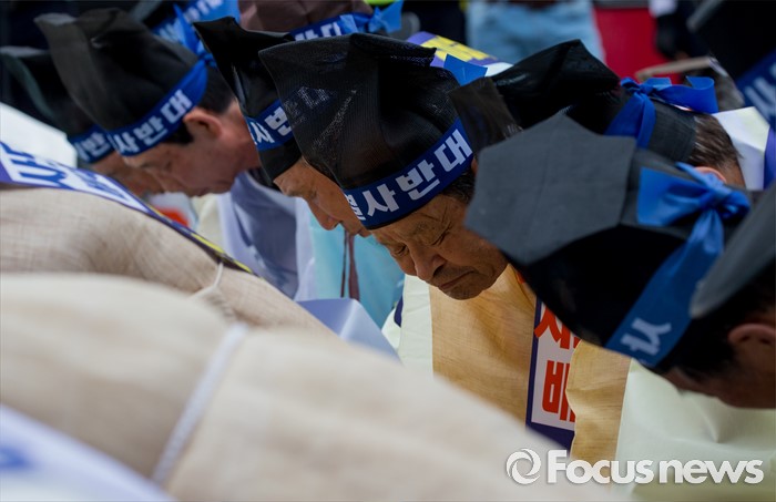(서울=포커스뉴스) 27일 오전 서울 종로구 청운효자동 주민자치센터 앞에서 열린 '사드 배치 반대 기자회견'에 참석한 성주 유림단체 회원들이 무릎 꿇고 있다.