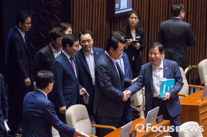 (서울=포커스뉴스) 정진석(오른쪽 두 번째) 새누리당 원내대표가 27일 오후 서울 여의도 국회에서 열린 344회 국회(임시회) 3차 본회의에 참석하기 위해 회의장으로 들어서고 있다.