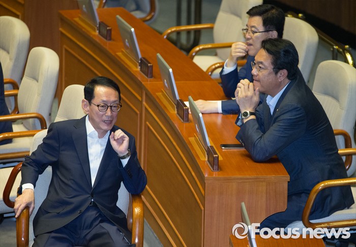 (서울=포커스뉴스) 27일 오후 서울 여의도 국회에서 열린 344회 국회(임시회) 3차 본회의에 참석한 정진석(오른쪽) 새누리당 원내대표와 김도읍 원내수석부대표가 대화하고 있다.