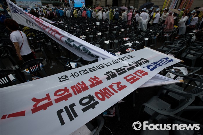 (서울=포커스뉴스) 27일 오후 서울 용산구 서울역광장에서 열린 사드배치 지지 범국민대회 및 자유민주평화통일 결의대회에 중앙보훈단체안보협의회·대한민국상이군경회 회원들이 사드 배치에 찬성하는 현수막을 정리하고 있다.