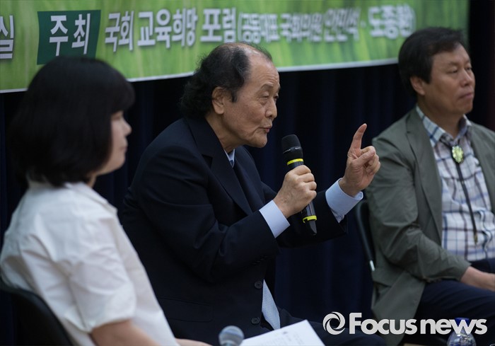 (서울=포커스뉴스) 27일 오후 서울 여의도 국회 의원회관에서 국회 교육희망포럼 주최로 열린 교육 토크 콘서트에 참석한 조정래(가운데) 작가가 발언하고 있다. 오른쪽은 도종환 더불어민주당 의원.